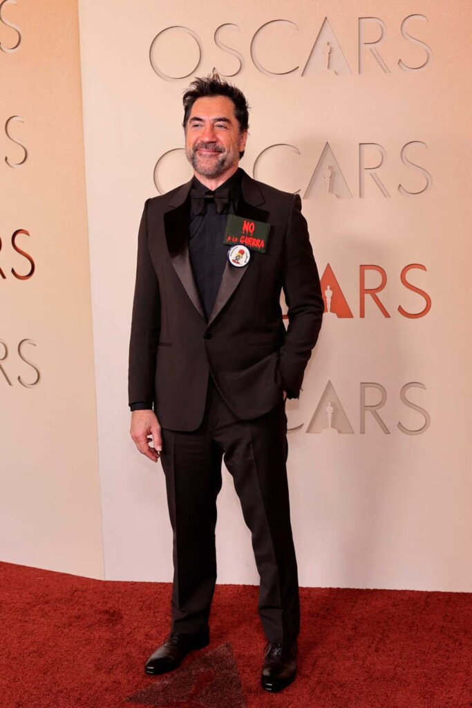 Javier Bardem llegó con un pin que dice ‘No a la guerra”, por la iniciada guerra en Irán. Y con otro pin con el niño Handala, símbolo de la causa palestina.